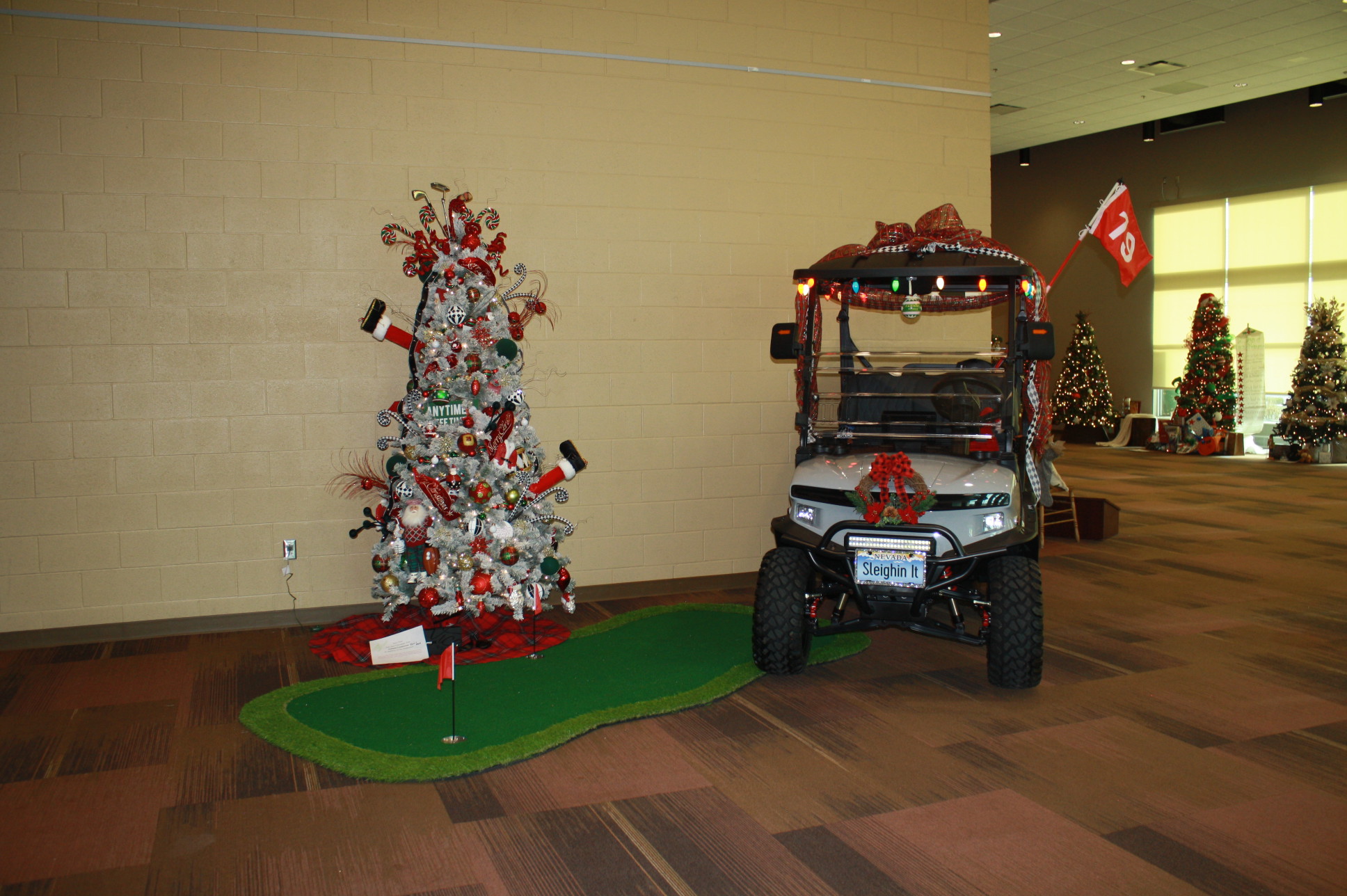 Going Golfing for Christmas! 7foot beautifully decorated flocked Christmas tree in traditional Scottish plaid colors AND a brand new 2025 Denago Nomad XL Electric Golf Cart sporting custom rims and tires to deliver packages in tough terrain! Top Speed 25mph. 10.1" touchscreen with Apple CarPlay/Android. LED Headlights and Taillights, LED light bar. Brush Guard. Comes with an indoor putting green and new GHOST GOLF bag ready to play your best game!