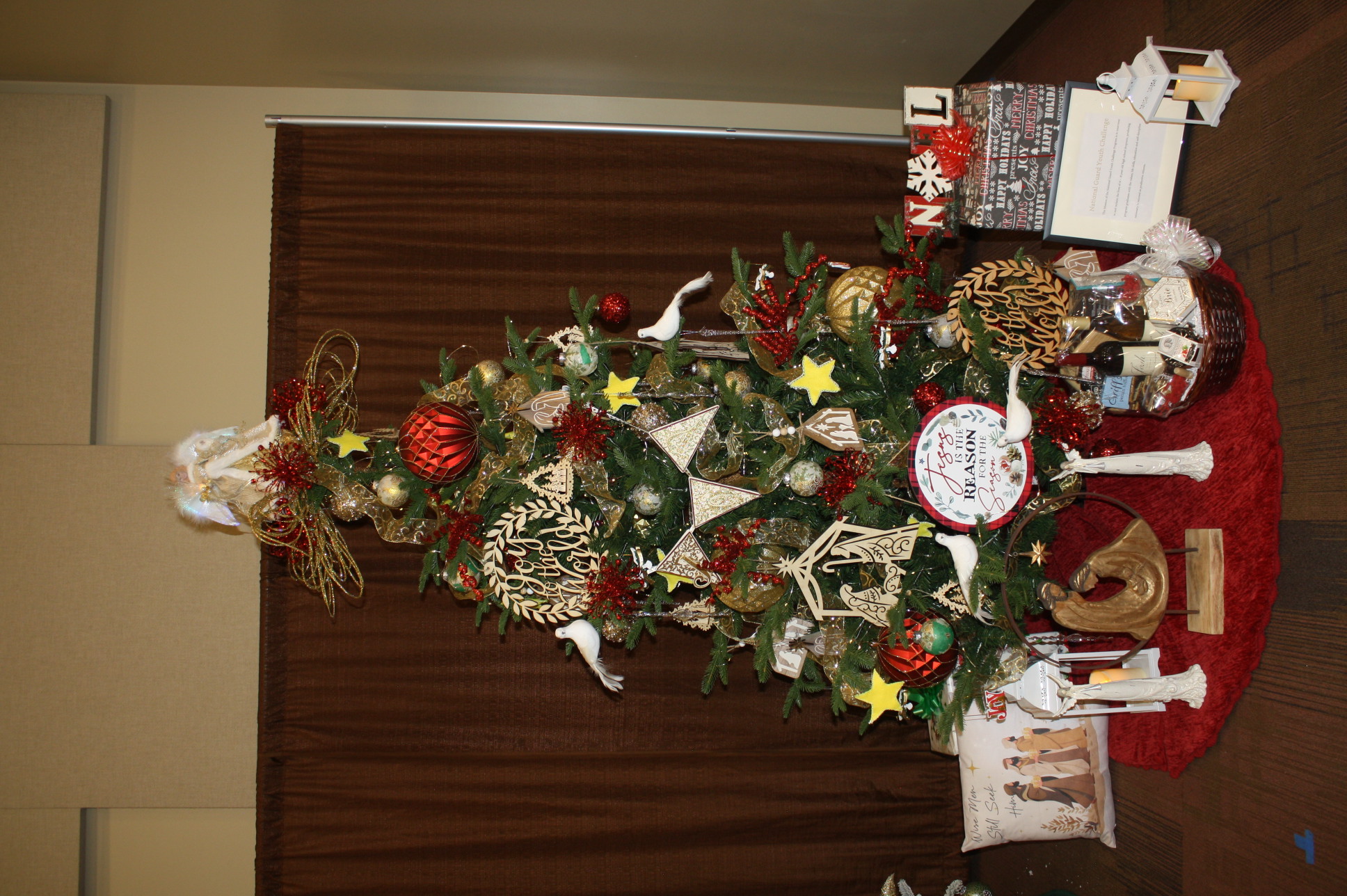 A Christmas tree decked out in red & gold with white doves. Under the tree you will find a wooden nativity and lovely gift basket.