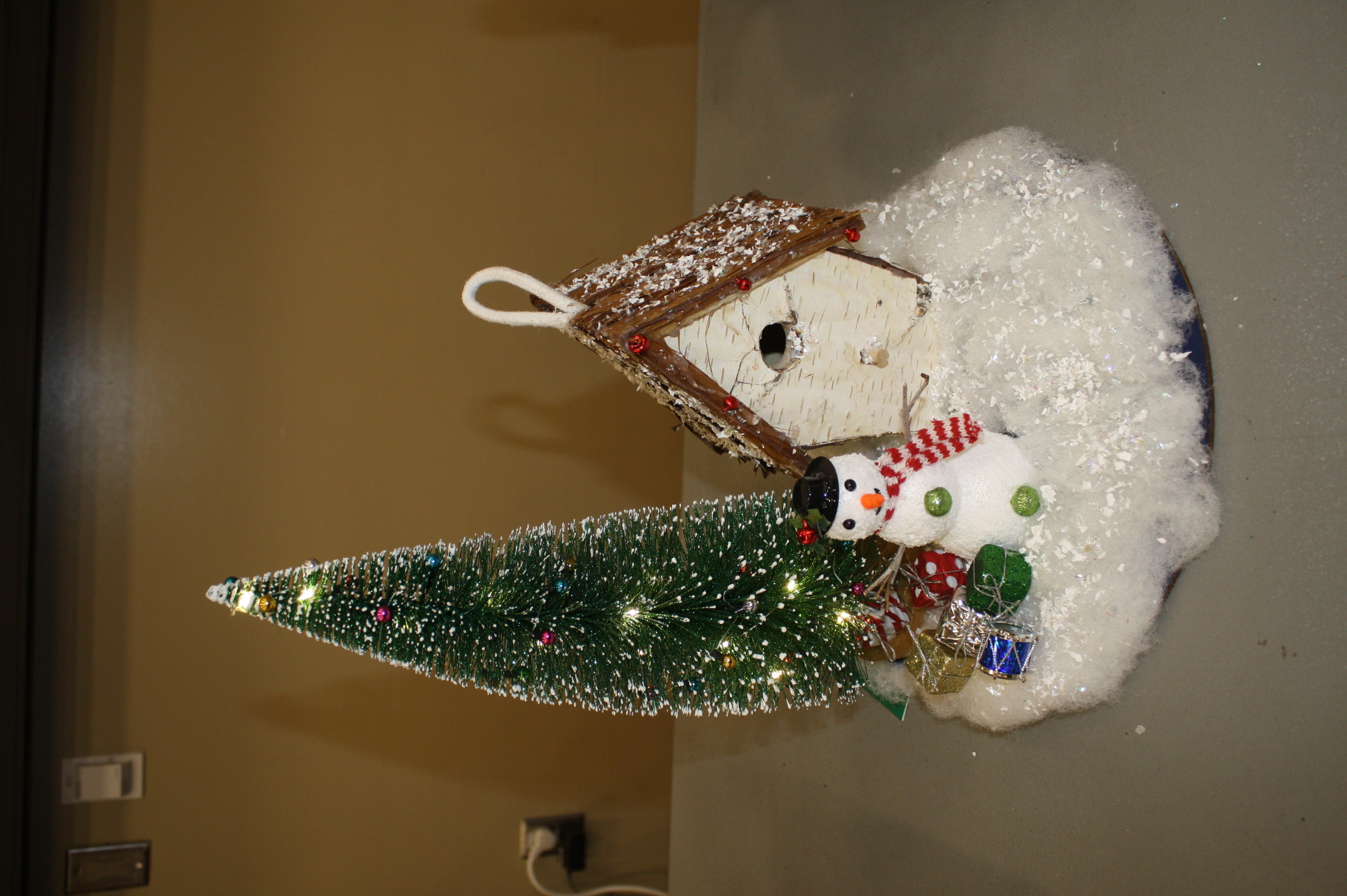 A beautiful centerpiece with frosty and a birdhouse. Lights to tree turn on!