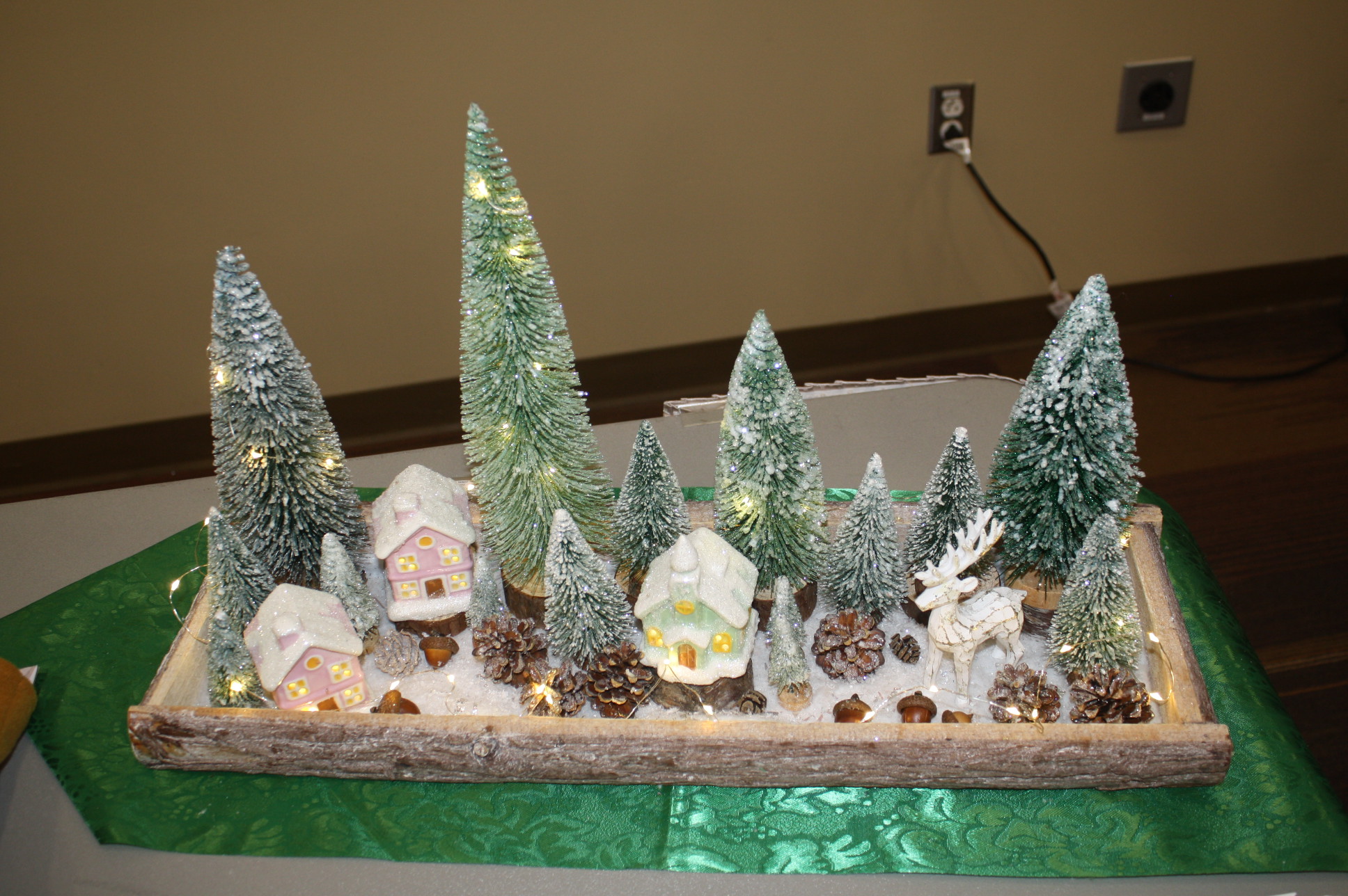 Winter wonderland centerpiece with trees, deer and mini houses. Sure to light up your holiday table!