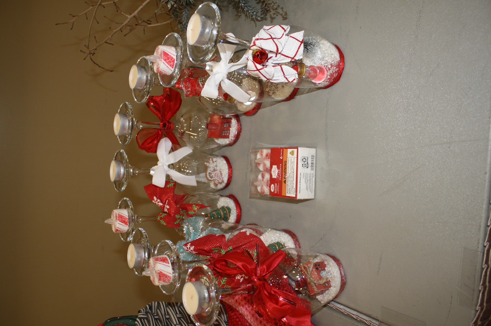These wineglasses have transformed into Christmas snow globes! Place candles atop and have a beautiful Christmas centerpiece!